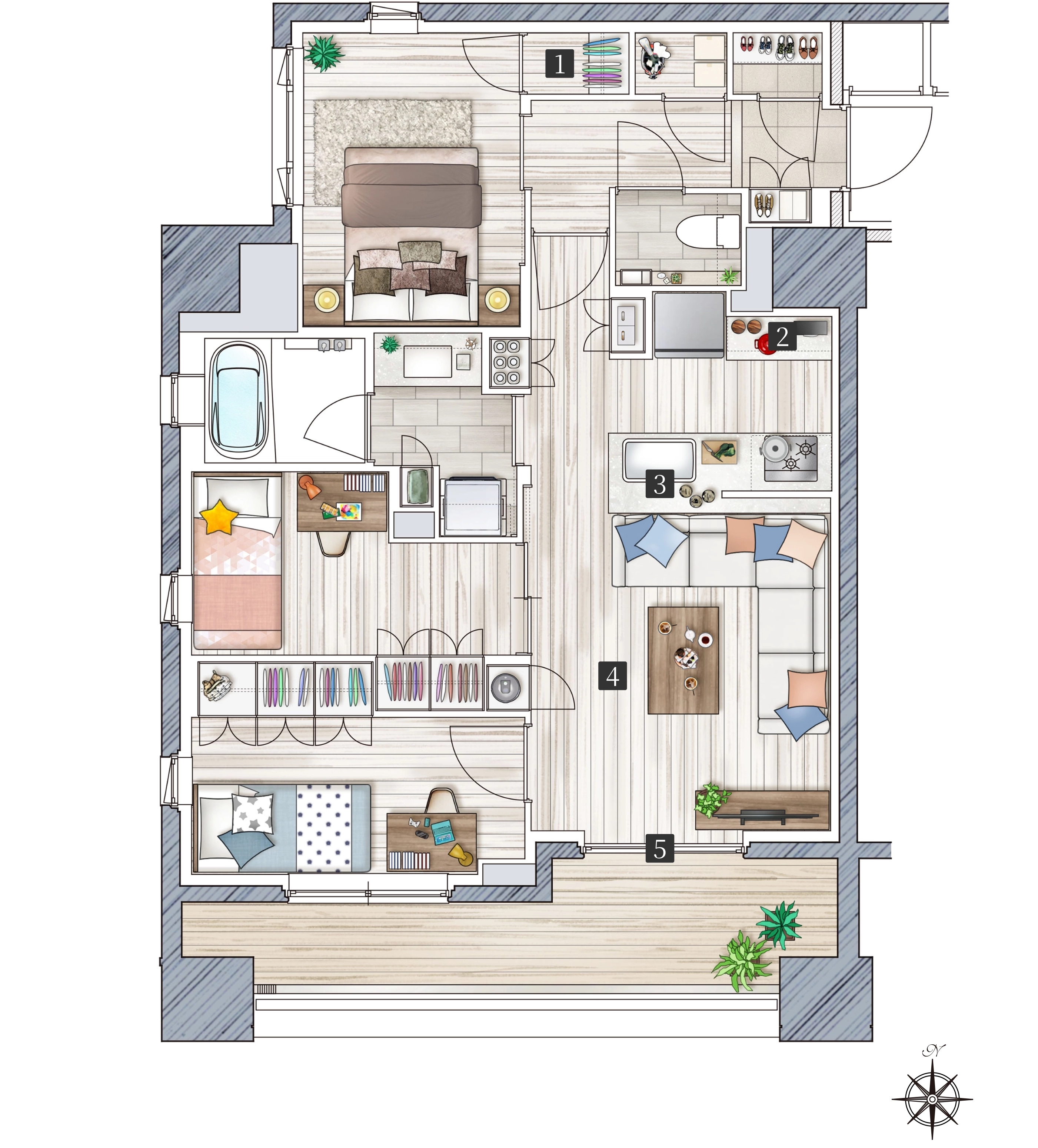 陽光あふれる全邸南向き・ワイドスパンに加え、1フロア3邸の住戸レイアウトにより、角住戸率約66%※の開放感に満ちた住空間を創出しました。また、すべてのフロアで上質さに包まれた内廊下設計を採用。外部からの視線が遮られプライバシーを保つことができます。